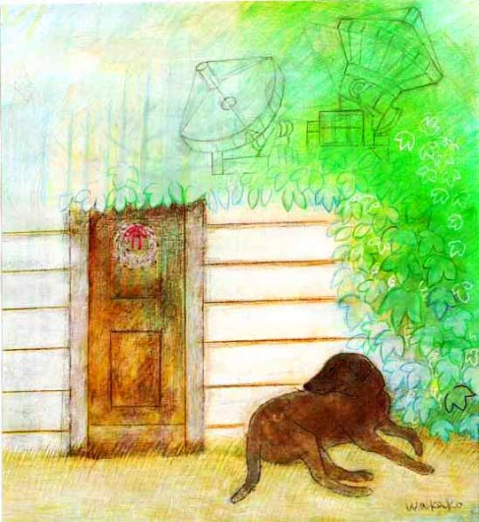 米国ハットクリーク電波天文台敷地内にある専属の学者リックの可愛いお家と犬のルーベン。夫の出張に同伴して私もこの天文台に滞在しこの絵を描きリックに原画をプレゼント。とても喜んでくれて早速オフィスに飾ってくれました。良い思い出です。
