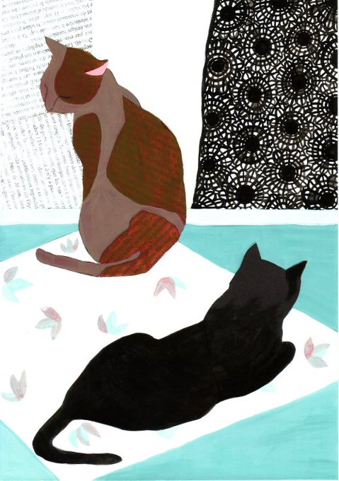 背中向けてるけど顔は微妙にこちらを向いてる猫の姿はシャイな(?!)感じがして可愛いですが、実際にはどんな気持ちでいるのでしょう?#cat #illustration #acrylicpainting #artwork #collage #猫 #イラストレーション #アクリル画 #コラージュ