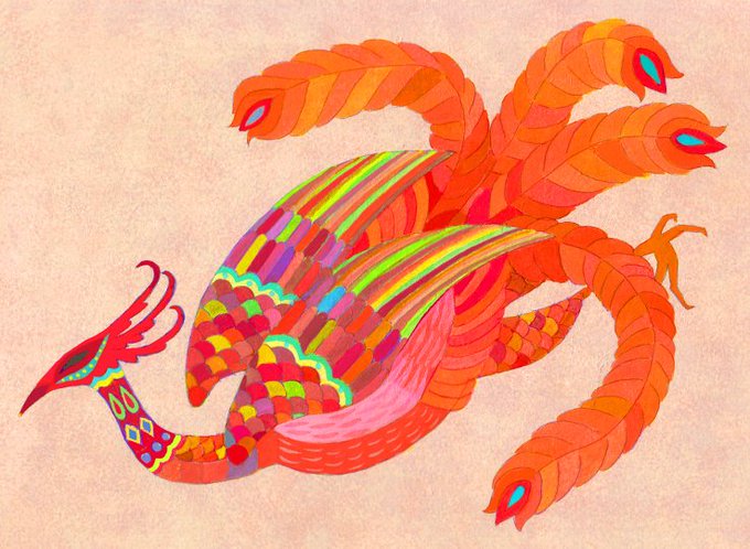 古代エジプトの伝説の鳥。燃えるイメージで赤っぽく、カラフルに着飾った「火の鳥」。#phoenix #illustration #acrylicpainting #artwork #不死鳥 #フェニックス #アート #イラストレーション #アクリル画