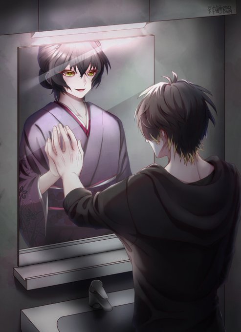 鏡の中の自分が摩耶に見えるトワ(もう怪談だよ怖えよ 鏡構図初めて描いてみたが、内容がホラー過ぎて何とも言えないな😂