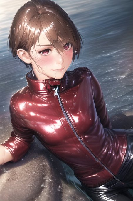 海に来た 服のまま入っちゃうの?? #NovelAI #レザー女子 #ライダース女子