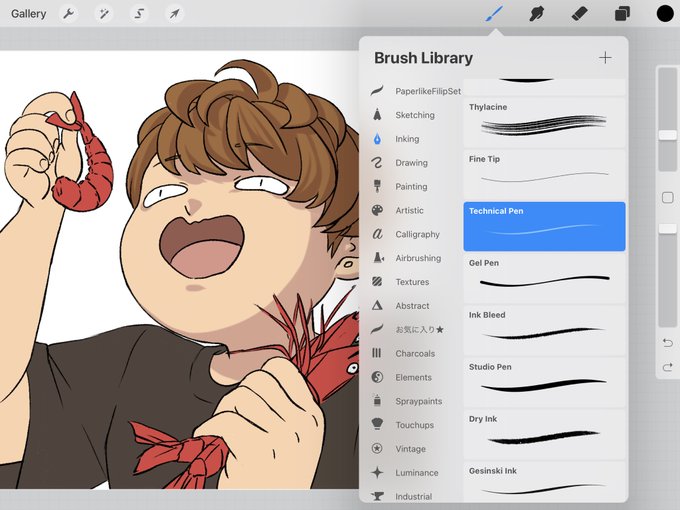 @ax_and_kido 私はプロクリエイト使ってます!インキングのフォルダ内のテクニカルペンというブラシをちょっとカスタムして濃くなったやつ使ってます!