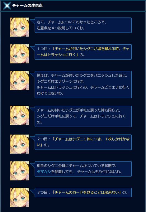 チャーム(charm)というのは、シグニの下に「付ける」ことができるカードの1種で、場を離れる際には必ずトラッシュに送られるぞ。