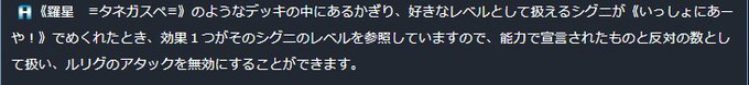 相手のルリグアタックを無効にできるかもしれないカード。置いておくだけで強い。デッキ内シグニのレベルを操作できるのなら、ほぼ確実にアタックを防ぐことができる。この後にサーバントでガードするか否かも決められる。