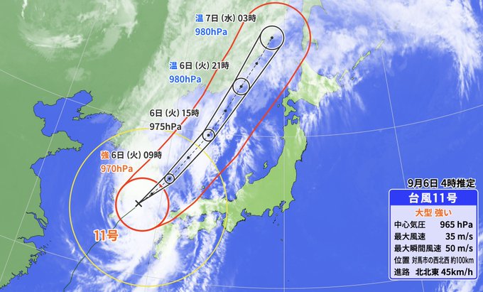 ・大型で強い台風11号は、速度を上げながら日本海を北上。