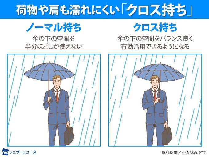 雨に濡れにくい傘の持ち方は「ローポジション」で、さらに「クロス持ち」をすると荷物も肩も濡れにくくなります。