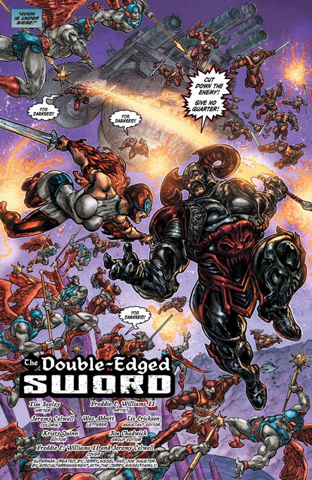 @INJUSTICEvMOTU @HeManTheMovie @LetsTalkMotU @Mark_Lapping @Biggybadass @stradlemonkey Solicit & Cover of Injustice vs MOTU #4! While He-Man is facing Superman on Earth, Darkseid is at Grayskull's gates! This turns EPIC, by @HackinTimSeeley & @Freddieart!