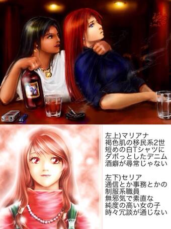 セリアは昔の少女漫画並に純粋な女の子です。ニコニコよく笑いますが、冗談でも騙されるとプンプン怒って口もきいてくれません。若干早口で「〜じゃん」「〜でしょ?」など。服はハイネックやマキシ丈が多いです。