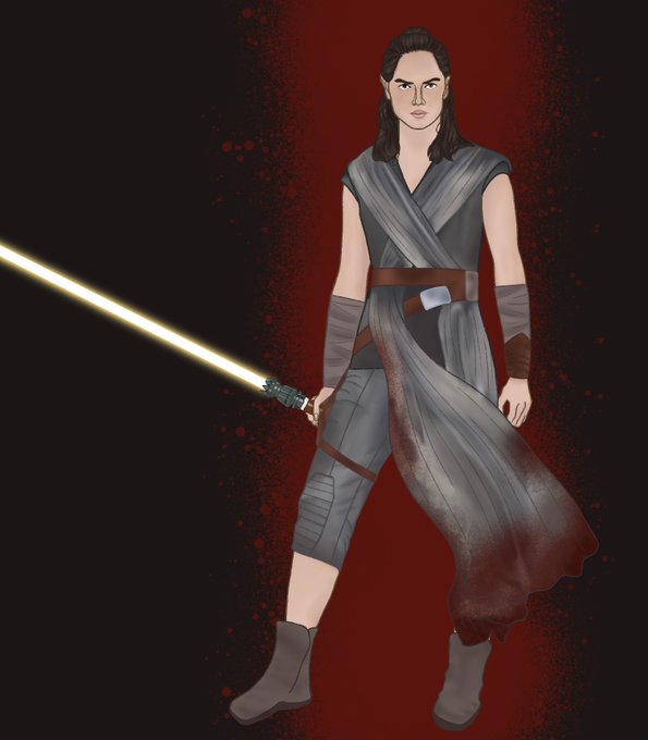 I imagine this as Rey's first "dark side" outfit. She wears it post-tros as she roams the galaxy in search of Ben. The stains grow darker as she does. She keeps the yellow saber because fuck the rules, she is done caring about them