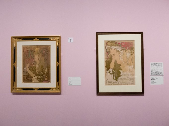 リトグラフやポスターを中心にミュシャの作品と、1960年代あたりからのレコードジャケット、漫画やゲームイラストなどミュシャの影響を受けた作品群。