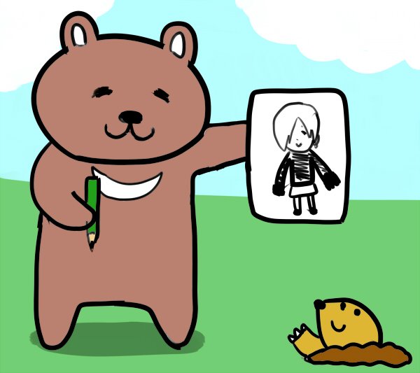 頑張って描いた小梅ちゃんを友達に見てもらうクマです