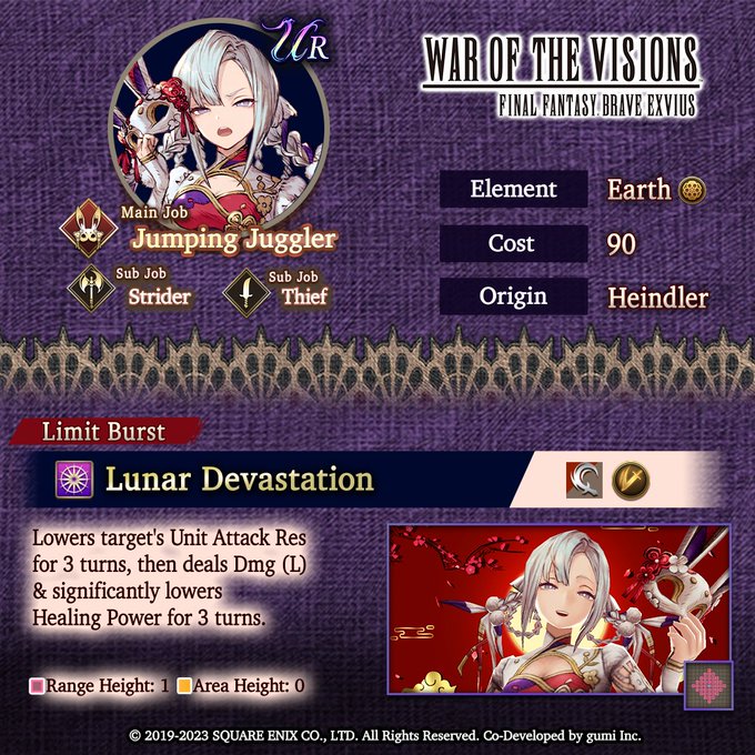 Her Limit Burst, Lunar Devastation, lowers the target's Unit Attack Resistance for three turns, then deals a large amount of damage, and significantly lowers Healing Power for three turns.