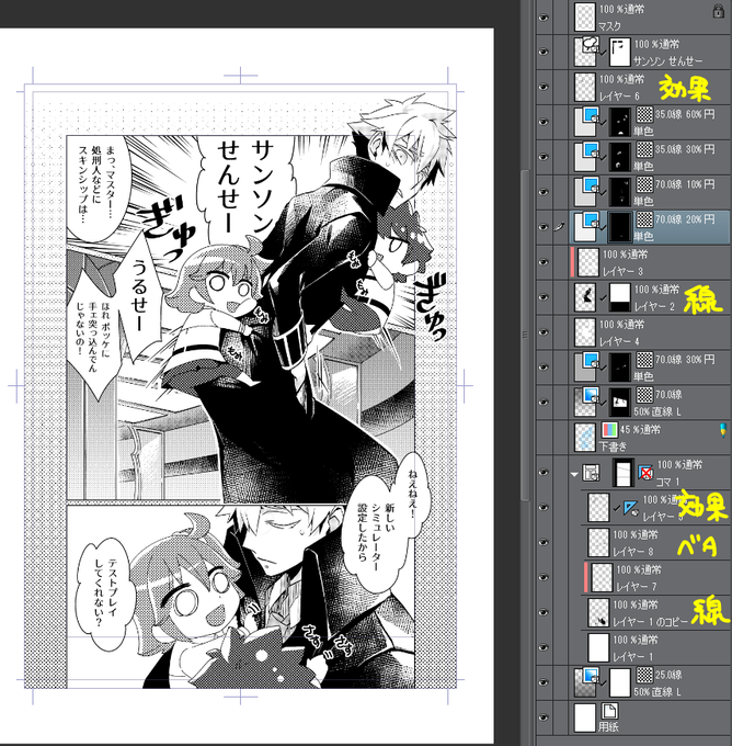 レイヤーは迷子になるので、なるべく減らすように頑張ったりグループ分けしたりします。グリザイユもどき絵の時は増えすぎてもうよくわからない😇マスクで範囲作るの便利です。