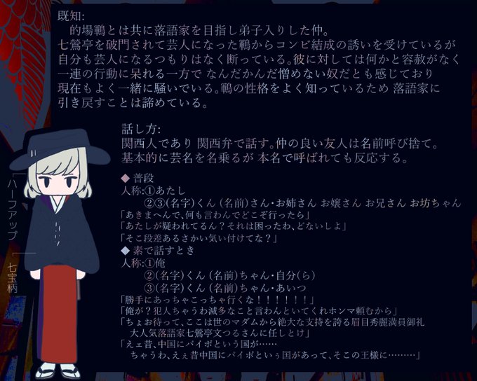 @6night_ronpa これは表情差分とは全く関係ないんですが、帽子ポンチョなしついでに後ろの資料です……修学旅行より前や高座に立つときはこの状態!
