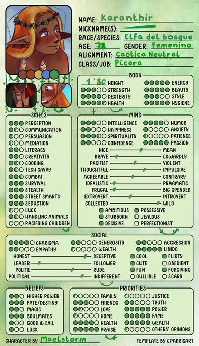 @NarumyNatsue Holiii pues te dejo por aquí a mi terremoto Karanthir. Es una elfa del bosque que no puede evitar robar todo lo que se le cruza en su camino y brilla. Es segura de sí misma y yo creo que la dinámica que tendría con Avan podría ser totalmente caótica.