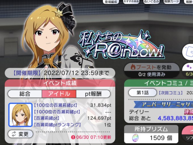 りおほー\(^o^)/ ふー‥とりあえず見せ場は作れたかな😅 #ミリシタ5周年 #百瀬莉緒