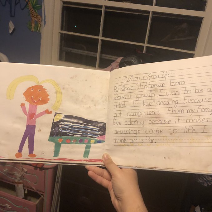 @MPhilop Hi there! 👋I can’t remember exactly when or where I started but there’s lots of pictures of little me drawing on everything! And even in second grade (7yrs old) I knew I wanted to be an artist. Here’s my recent work as well as the image of “future me” from over 10yrs ago!