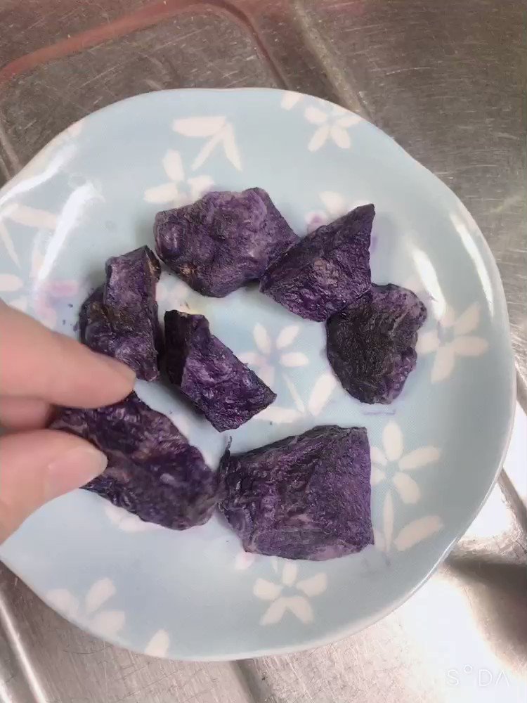 なんかサクサクしてるし干し芋みたいだったり色んな食感が楽しめる。 向いて洗って切ったじゃがいもを皿に乗せてラップせずに、600wで6分。 食えるアメジスト✨💎