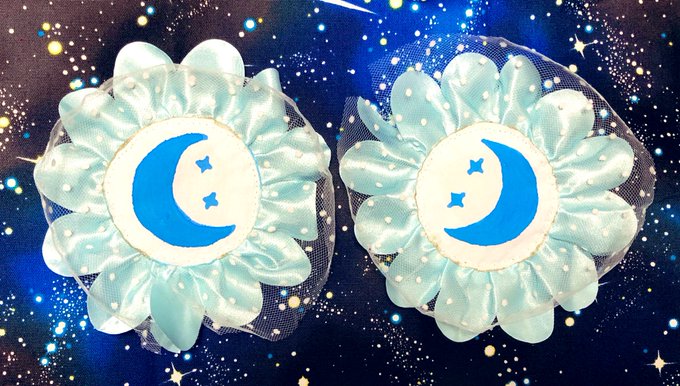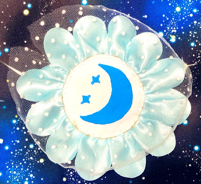 自画像に使ったフリルの残りで作ってみました。バレッタやブローチにしたりヘドレのアクセントにしようかと思ってます🌙月と星を描いた布描きペン以外材料は全て100均!!