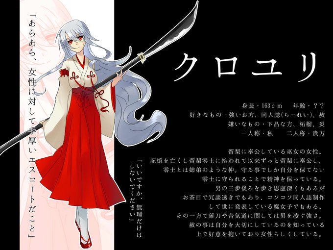赦クロ 謎のストーカー青年と記憶喪失に巫女さん。 自分のことをよく知った上で昔は親しい仲だったことを仄めかして辛辣だけど好意めちゃくちゃ飛ばしてくる赦となんだかんだ赦のこと嫌いじゃなくてむしろ好きなクロユリ。 ただ記憶がなくてクロユリは赦の本名を呼ぶことは出来ないから貴方様と呼ぶ。
