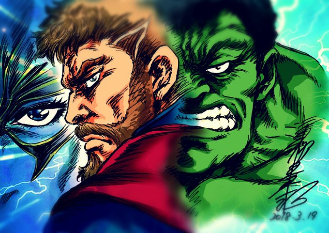 「マイティ・ソー バトルロイヤル」見ました❗前二作とはまったく別ジャンル。ギャグ映画になってました(^-^;💦ツェッペリンの曲がサイコーに燃えた❗マッド・デイモンがなぜここに?ってドッキリも👍 #落書き #イラスト #マイティソー #マーベル #ハルク #映画 #アメコミ #アベンジャーズ