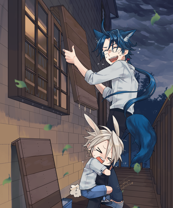 壁紙です。 嵐に備えて準備をするラシエルと「お家に居てね」と言われたが、風の音がすごいし尻尾がぼわぼわするので怖くなって出てきてしまうクラウドです。危ないから中に居ようね。