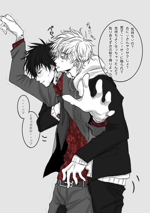 学生坂田×ヤクザ方さん。 電車で痴漢にあうヤクザ方さんとか可愛いくない?吊り革持って必死に耐えてんだよ?えっちだね? (背景と吊り革は私の画力では描けませんでした。)