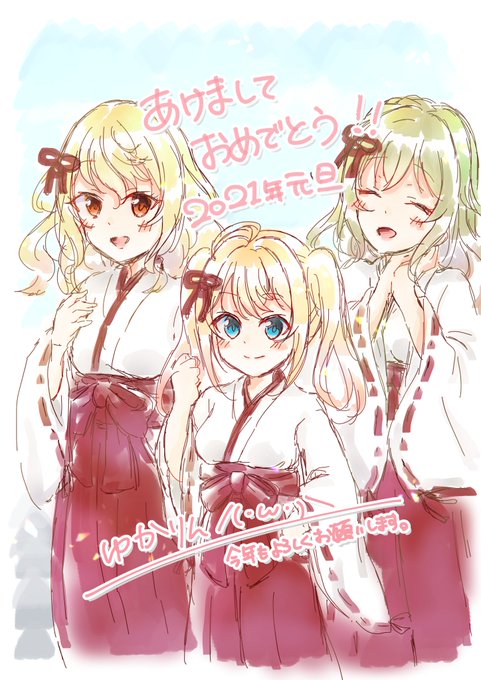 おけおめことよろです | ゆかりん/(・ω・)\ #pixiv #東京ドールズ #アヤ #レイナ #シオリ #リーダーズ #あけおめ #正月 #巫女 https://t.co/hOLJyNX0y7