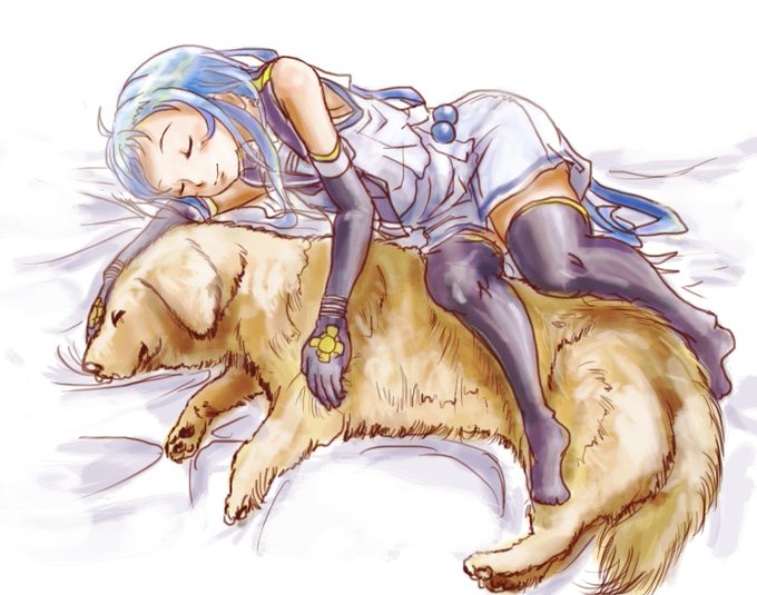 自分の身長くらいの大型犬とお昼寝する五月雨ちゃん