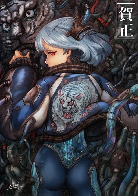 2022年年賀絵🐯 久しぶりの投稿ですが本年もよろしくお願いします! #2022年 #虎 #アンドロイド #少女 #イラスト #コード好き