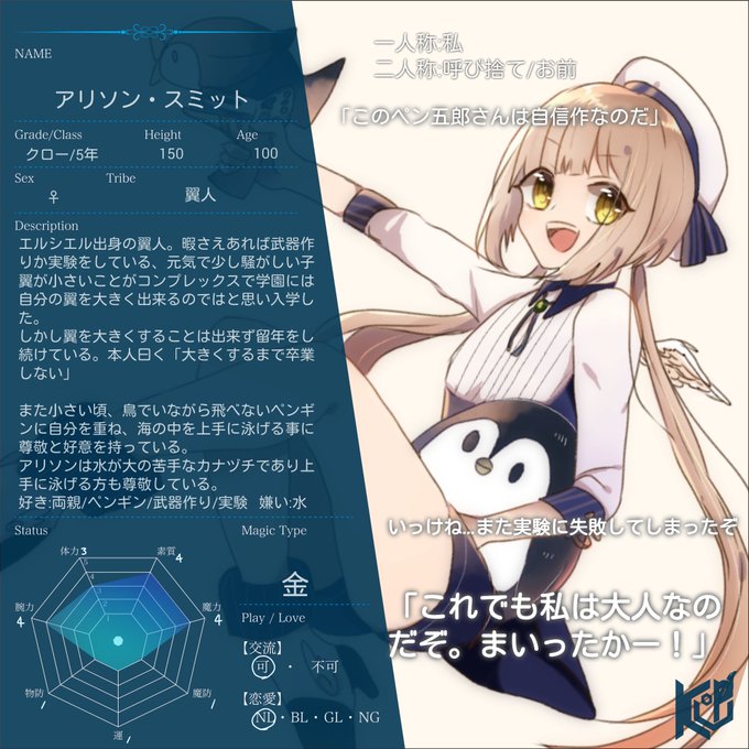 こちらの企画【@toten_teufel】に2人目失礼します。クロー5年の少し騒がしいペンギン大好きっ子です。よろしくお願い致します #テトイ_CS #テトイ_恋愛可