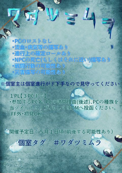 #流転のグリマルシェ #ワダツミムラ ダイス使って調査して色々調べたりするストーリー個室を開催予定です。 それに伴い、参加者を募集致します!! 質問などはお気軽にどうぞ!