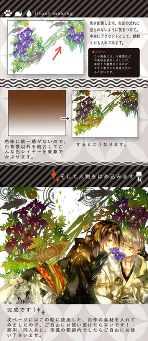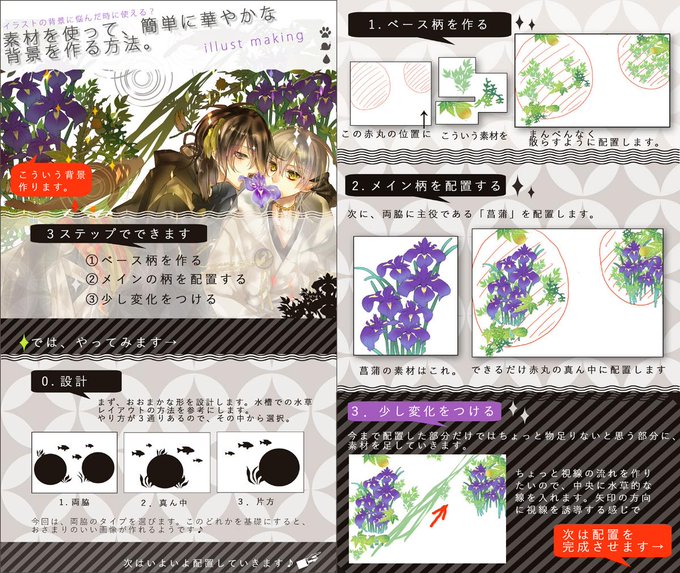 イラストの背景によく悩むので、自分流ですが、素材を使って、簡単に華やかな 背景を作るやり方をまとめました。商用利用OKの素材もつけてます。ご覧いただけると幸いです…!