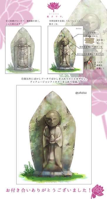 風景絵を描くとき、石でできたオブジェを描かなければならないことが多いのですが、意外に難しいので、忘備録もかねてメイキングを作ってみました。苔協力:紺野さん(@konken5) よろしければご覧ください!