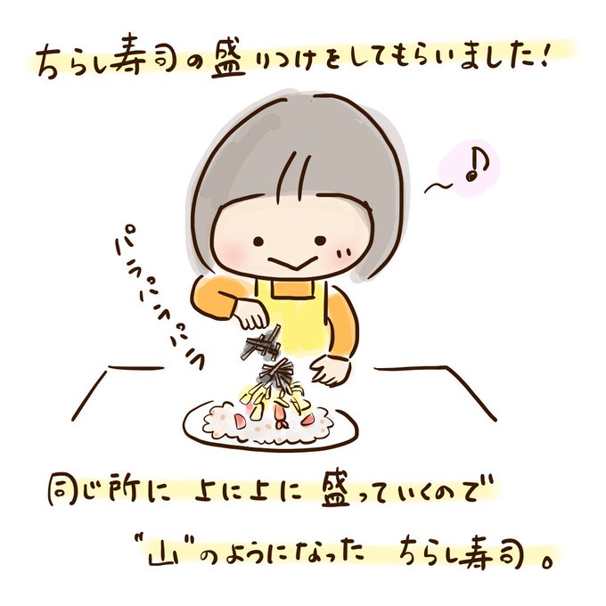 ちらし寿司の盛り付けを娘にしてもらったら、同じ所に上に上にのせていくから、山みたいに高くなったよ。食べてる所を動画に撮っていたんだけど、撮り終わると娘が…!!? #ひなまつり #育児絵日記 #うちのおこ