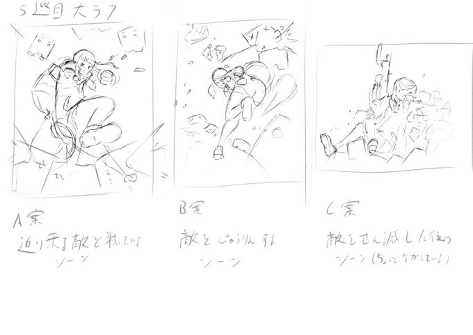 今日は大ラフまで。3案全てバイオレンスなので、えぐみを抑えてさわやかに仕上げたい😓
