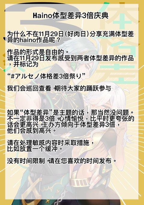 【企画】アルセノ体格差3倍祭り✨🎉 11月29日(いい肉の日)に体格差もりもり💪のアルセノ作品を投稿しませんか!? 作品の形態は自由です。二人の体格差を感じる作品に「#アルセノ体格差3倍祭り」とタグを付けて11月29日に投稿してください。巡回させていただきます。たくさんの参加お待ちしてます!