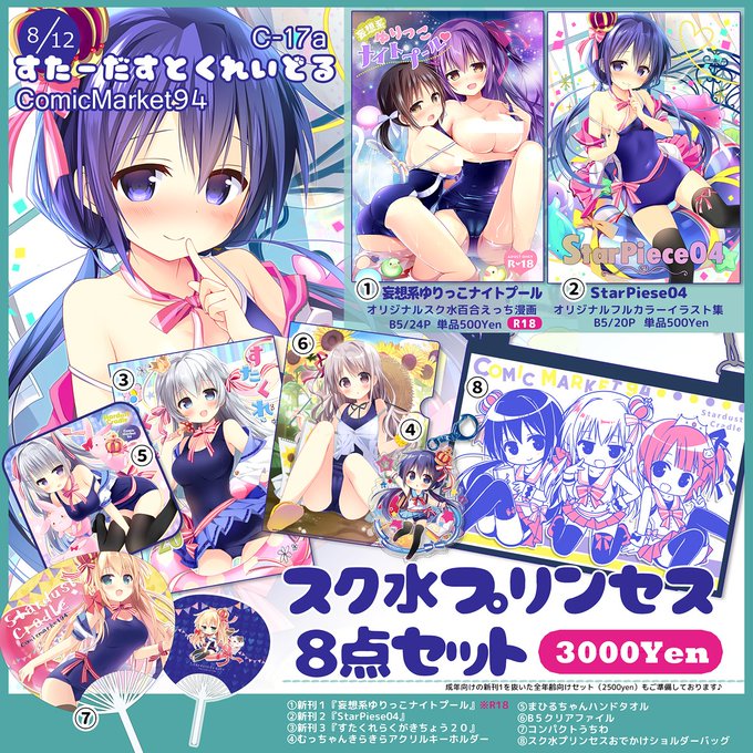 【C94お品書き】夏コミのおしながきできました!今回もスク水いっぱいです♪ 3日目C-17a『すたーだすとくれいどる』でお待ちしています!よろしくです~(≧ω≦)
