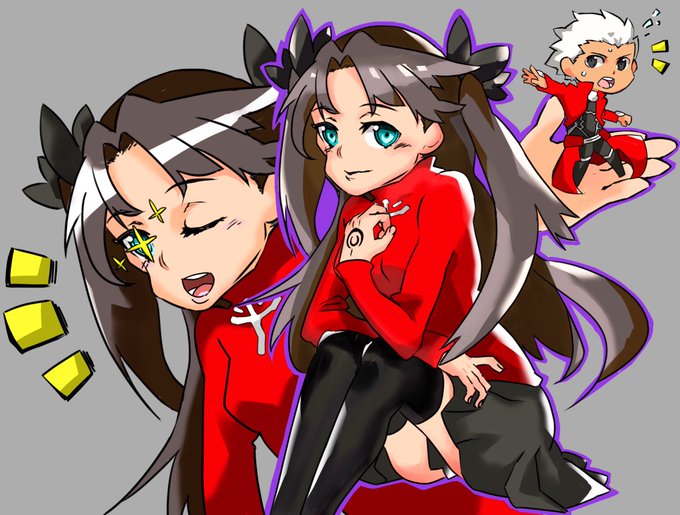 Fateの遠坂凛とアーチャーのエミヤ!今回のエミヤのチビキャライラストはなかなかいい!あとでヘッダー用で投稿しとくのでご自由にお使いください!