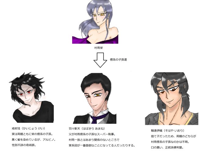村雨一族の家系図、かなり雑になっちゃったけど完成……。羽々斬さんち家庭事情のとこもやろうかと思ったが、面倒くさい上にあんまり村雨と関係ないので省略した。これで村雨一族の供養は完了と言っても過言ではないでしょう……。