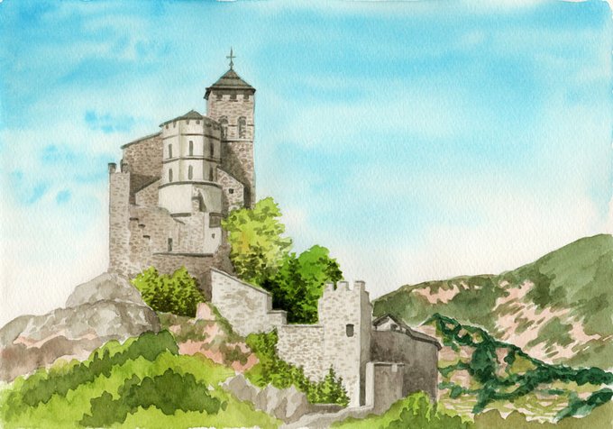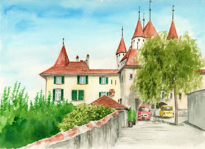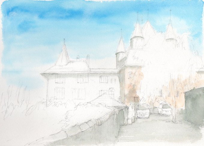 #水彩画 #アナログ画 #制作過程 #メイキング #風景画 #スイス #お城 #GWはフォロワーさんが増えるらしい