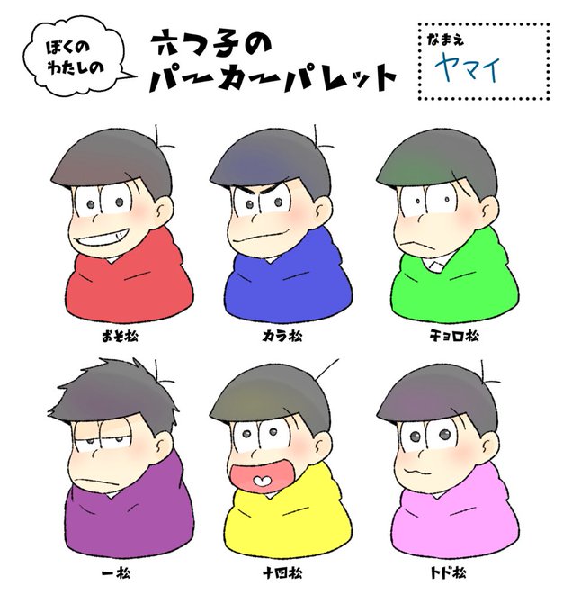 #六つ子のパーカーパレット 線画お借りしました:;(∩´﹏`∩);: おそまつにきのは真っ赤というよりあわいかんじがいいなぁ うすめの。 あんまり決まってないけど!