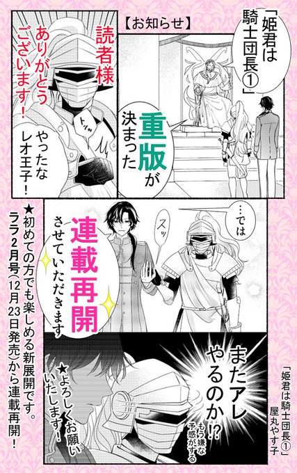 なんと「姫君は騎士団長①」緊急重版と連載再開が決定しました!