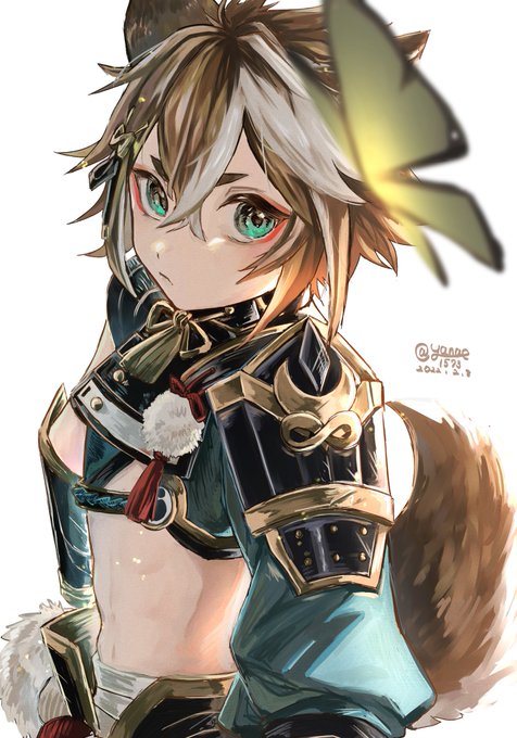#原神 ゴローくん首肩周りはがっちり着込んでるのにお腹周辺が無防備。触られちゃうぞ。待機モーションで蝶々追いかけるの我慢してるの可愛い。