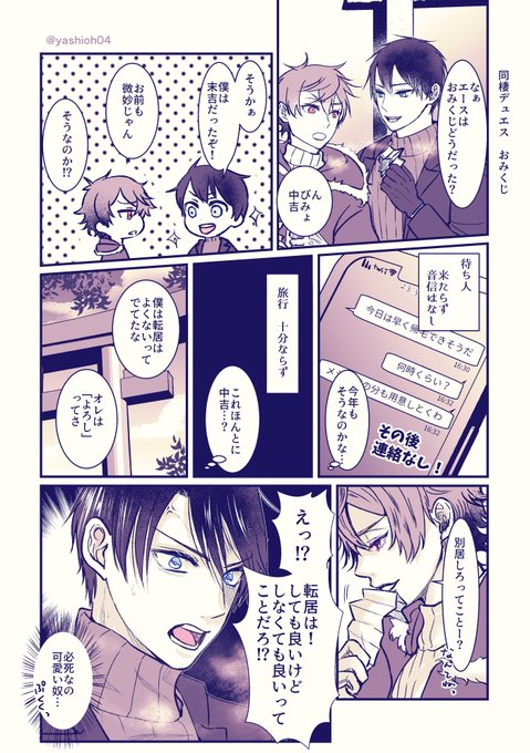 #A受けワンドロワンライ #デュエス深夜のお絵描き一本勝負 @Auke_60min お題:おみくじ ※同棲してるデュエスです。 ※おみくじ結果は捏造です。 続きあるんですけど1hどころじゃなので また今度! 遅刻&時間おーばーです。 あげ直しすいません