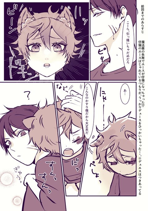 仔猫🐱のえーしゅ❤の話。②と③ ※♠流血表現有(軽度)仔猫に引っ掻かれた ※顔有♂監督生、年齢操作、猫化 元々は付き合ってるデュエス