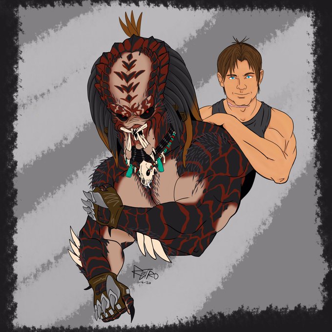 🔺An older ‘quickie’ from January! 💚 Figured I’d share it as my #yautja #oc Dhi’nok, & my friend’s sniper Vinny will be getting more art! 💀 Dhi’nok is about 9’1”, & beefy, so big for a male #predator. Vinny clocks in at 6’1”.🔺