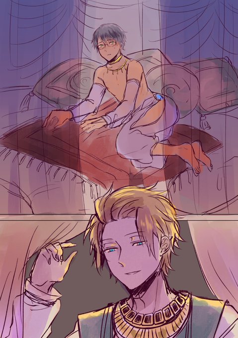 人の呟き見てアラビアンパロ描きたくなったのじゃ…胸を隠すか隠さないかで迷って両方描いた。私はあんまり女装っぽくない方が好きかも知れん(迅修)