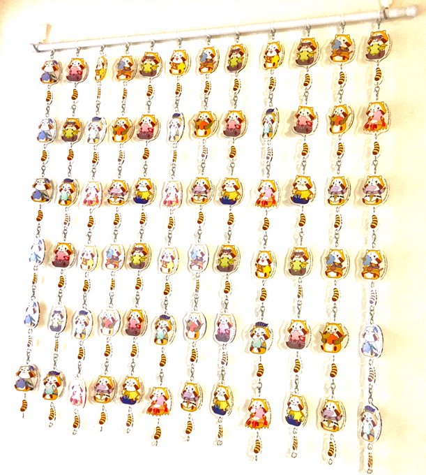 やっと…!ラスカルの繋がるチャームで暖簾を…つくりました…! いつか必ずと…少しずつ溜め込んで…しかし暖簾にするには当たると痛いので…壁に飾ります…( ;∀;)