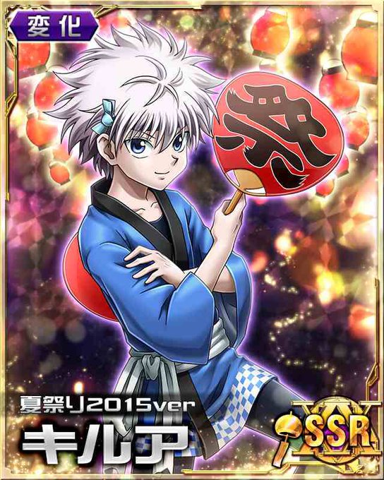 今回はキルアから一枚😄✨夏祭りカードです☺️✨最初みた時は !?😄でした😄✨でも似合っているし、かわいいですよね☺️✨祭って書いてあるうちわをもっているのが愛らしいです😊✨後ろにももう一枚持っていますね😄このうちわを両手に持って、お祭り音頭を踊って欲しいですね😄❤️✨